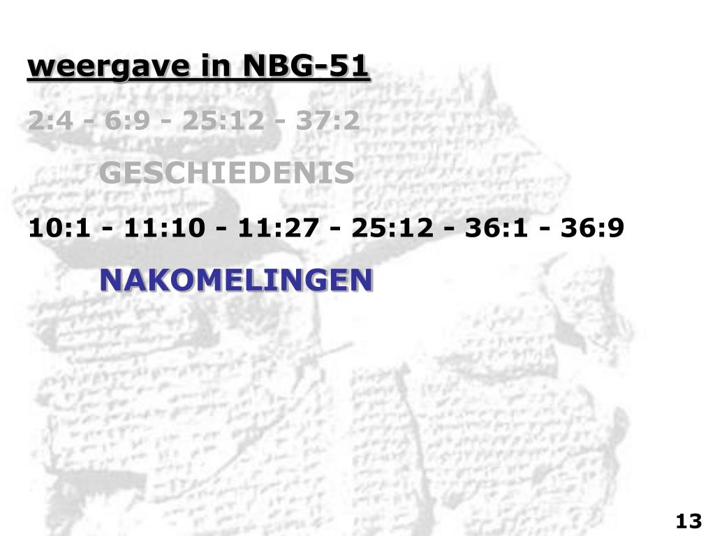 weergave in NBG-51 2:4 - 6:9 - 25:12 - 37:2 GESCHIEDENIS 10:1 - 11:10 - 11:27 - 25:12 - 36:1 - 36:9 NAKOMELINGEN X Fatal Error Inconsistent OK ?? 14