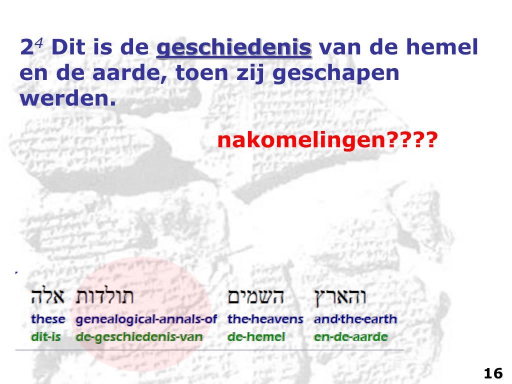 24 Dit is de geschiedenis van de hemel en de aarde, toen zij geschapen werden. nakomelingen???? 16