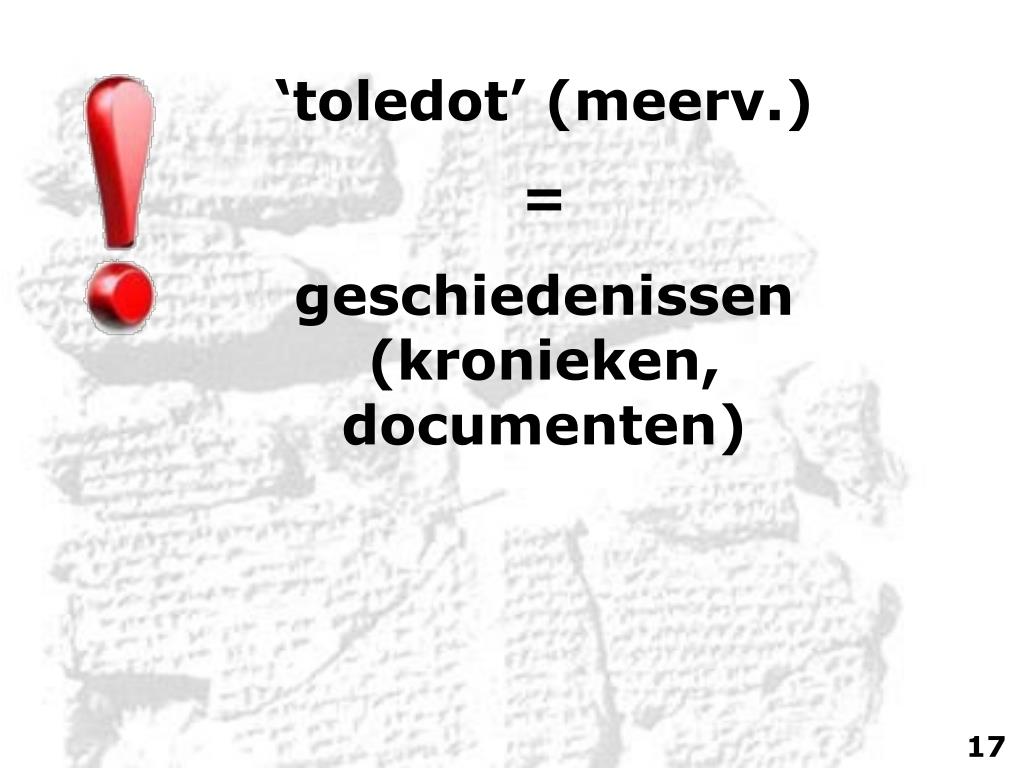‘toledot’ (meerv.) = geschiedenissen(kronieken, documenten) 17