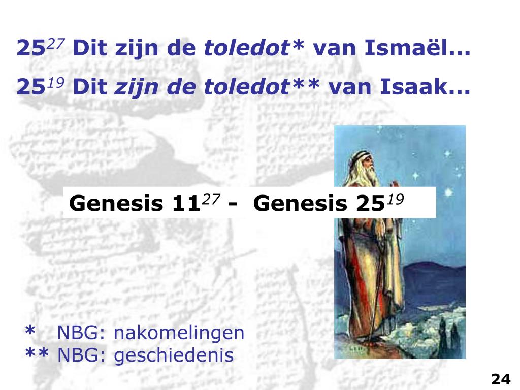 2527 Dit zijn de toledot* van Ismaël... 2519 Dit zijn de toledot** van Isaak... Genesis 1127 - Genesis 2519 * NBG: nakomelingen** NBG: geschiedenis 24