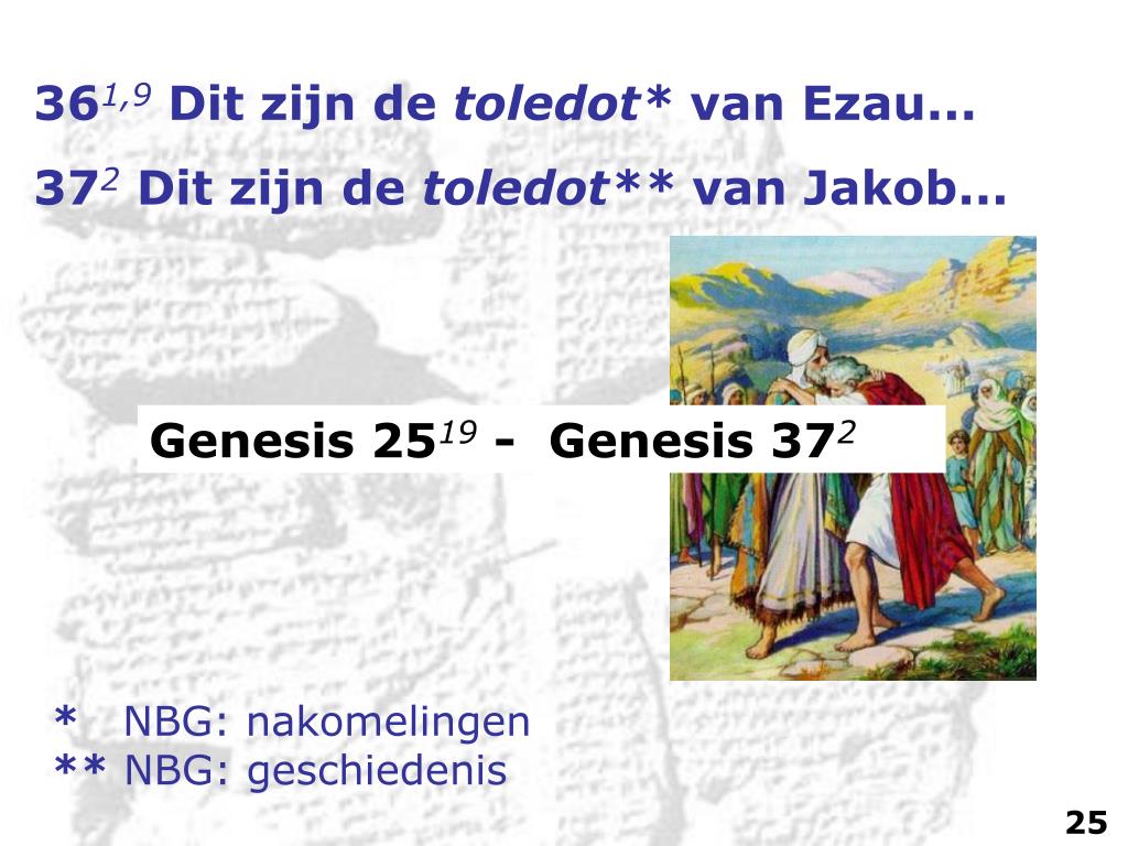 361,9 Dit zijn de toledot* van Ezau... 372 Dit zijn de toledot** van Jakob... Genesis 2519 - Genesis 372 * NBG: nakomelingen** NBG: geschiedenis 25