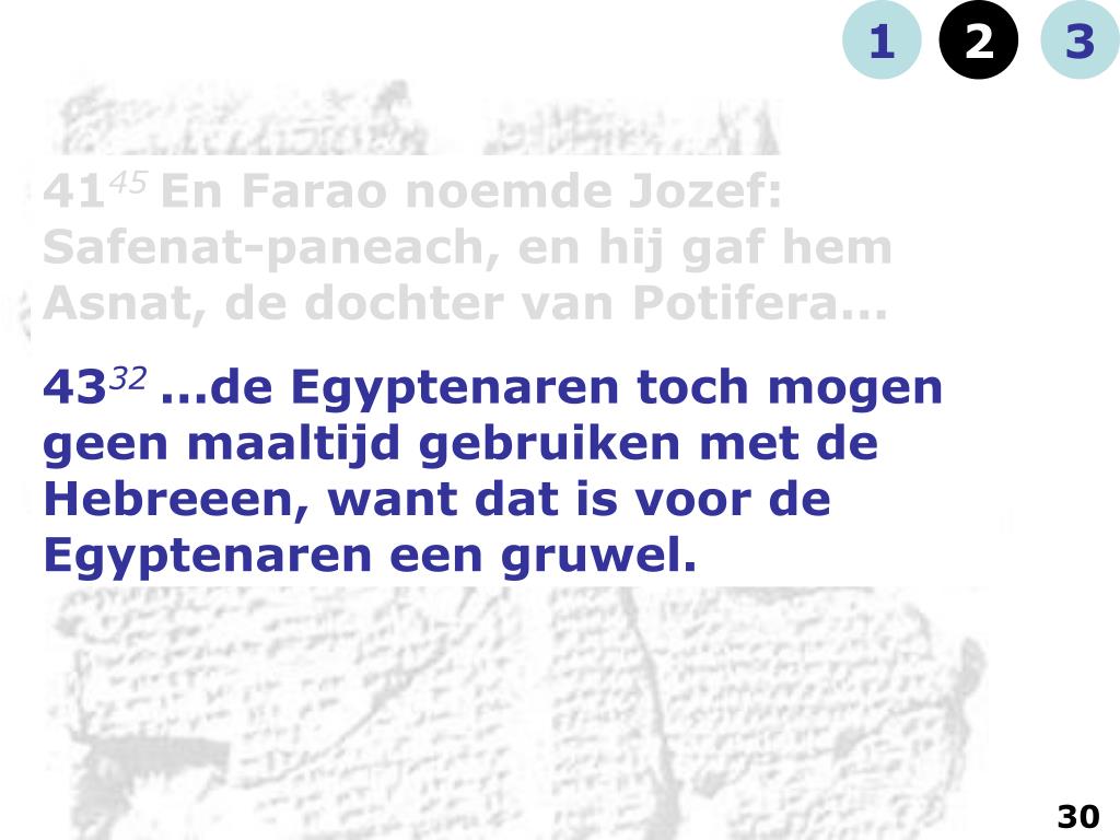 1 2 3 4145 En Farao noemde Jozef: Safenat-paneach, en hij gaf hem Asnat, de dochter van Potifera... 4332 ...de Egyptenaren toch mogen geen maaltijd gebruiken met de Hebreeen, want dat is voor de Egyptenaren een gruwel. 30