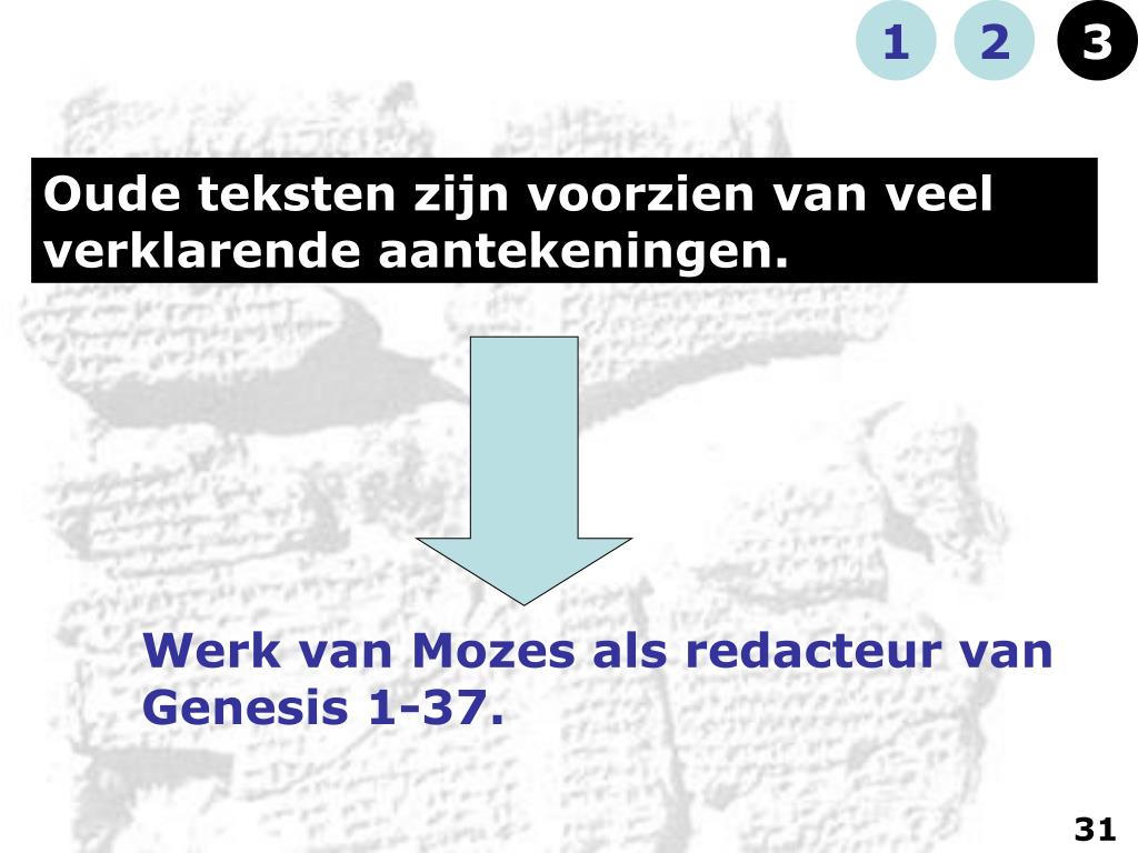 1 2 3 Oude teksten zijn voorzien van veel verklarende aantekeningen. Werk van Mozes als redacteur van Genesis 1-37. 31