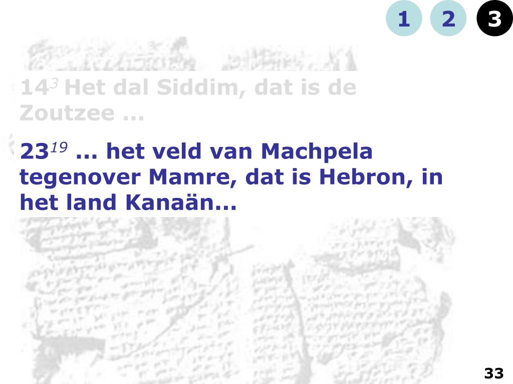 1 2 3 143 Het dal Siddim, dat is de Zoutzee ... 2319 ... het veld van Machpela tegenover Mamre, dat is Hebron, in het land Kanaän... 33