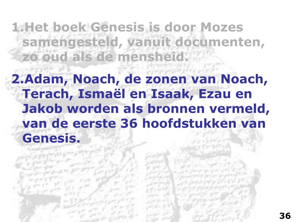 Het boek Genesis is door Mozes samengesteld, vanuit documenten, zo oud als de mensheid. • Adam, Noach, de zonen van Noach, Terach, Ismaël en Isaak, Ezau en Jakob worden als bronnen vermeld, van de eerste 36 hoofdstukken van Genesis. 36