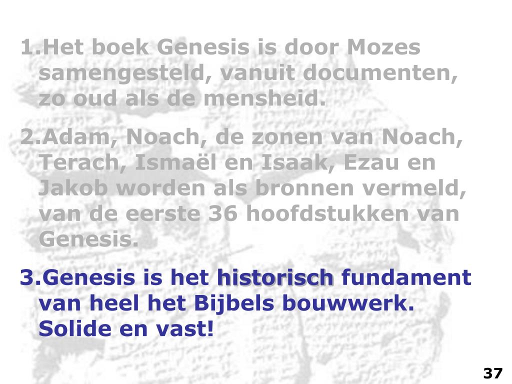 Het boek Genesis is door Mozes samengesteld, vanuit documenten, zo oud als de mensheid. • Adam, Noach, de zonen van Noach, Terach, Ismaël en Isaak, Ezau en Jakob worden als bronnen vermeld, van de eerste 36 hoofdstukken van Genesis. • Genesis is het historisch fundament van heel het Bijbels bouwwerk.Solide en vast! 37