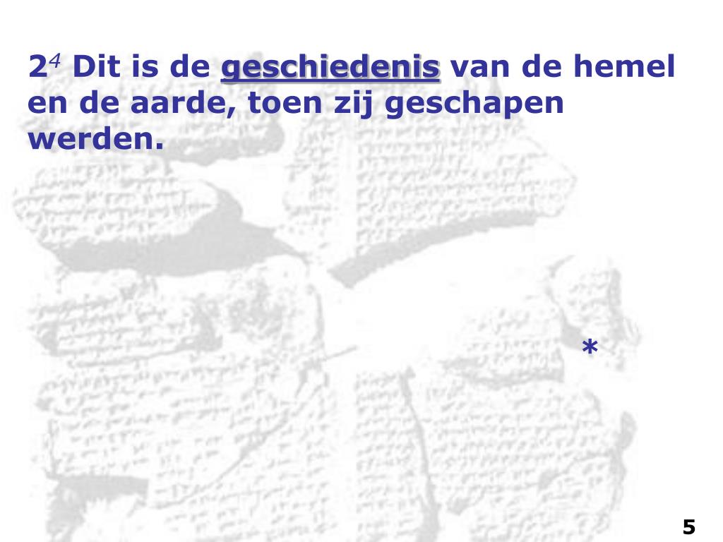 24 Dit is de geschiedenis van de hemel en de aarde, toen zij geschapen werden. * 5