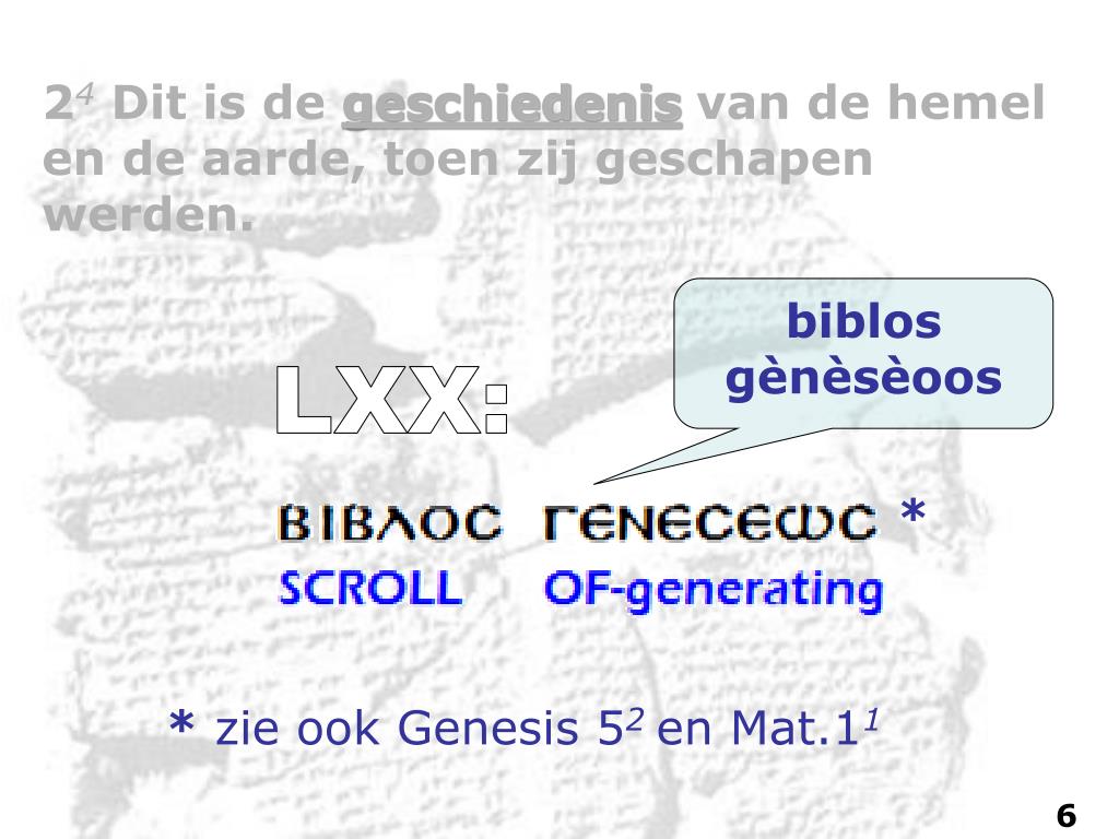 24 Dit is de geschiedenis van de hemel en de aarde, toen zij geschapen werden. biblos gènèsèoos LXX: * * zie ook Genesis 52 en Mat.11 6