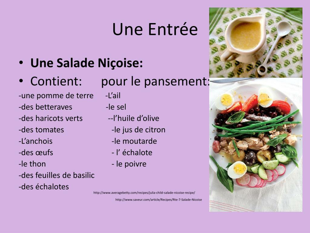 Une Entrée • Une Salade Niçoise: • Contient: pour le pansement: -une pomme de terre -L’ail -des betteraves -le sel -des haricots verts --l’huile d’olive -des tomates -le jus de citron -L’anchois -le moutarde -des œufs - l’ échalote -le thon - le poivre -des feuilles de basilic -des échalotes http://www.saveur.com/article/Recipes/Rte-7-Salade-Nicoise http://www.averagebetty.com/recipes/julia-child-salade-nicoise-recipe/