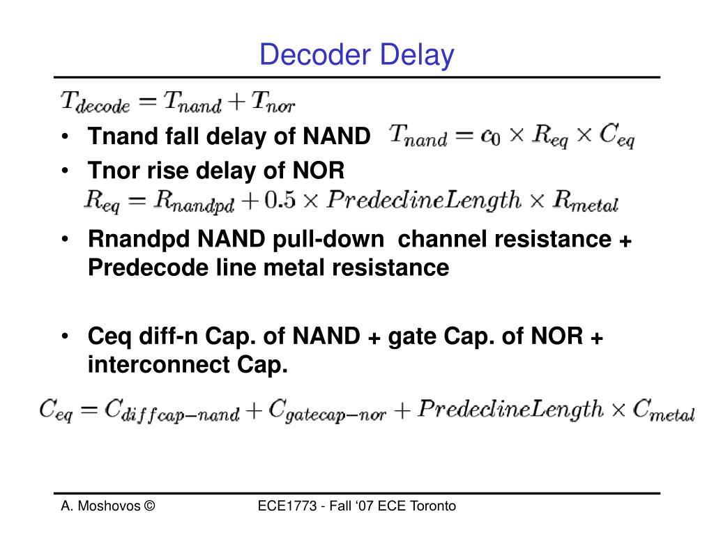 Decoder Delay • Tnand fall delay of NAND • Tnor rise delay of NOR • Rnandpd NAND pull-down channel resistance + Predecode line metal resistance • Ceq diff-n Cap. of NAND + gate Cap. of NOR + interconnect Cap. ECE1773 - Fall ‘07 ECE Toronto