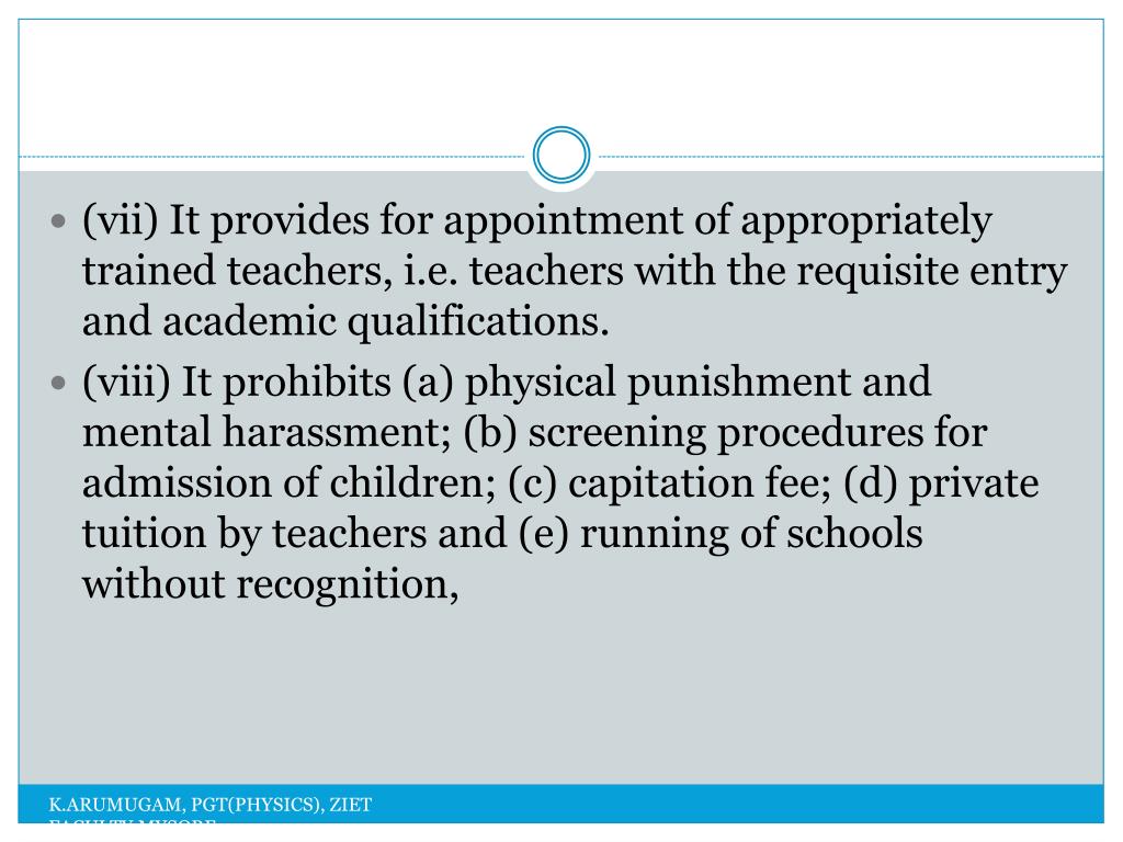 (vii) It provides for appointment of appropriately trained teachers, i.e. teachers with the requisite entry and academic qualifications. (viii) It prohibits (a) physical punishment and mental harassment; (b) screening procedures for admission of children; (c) capitation fee; (d) private tuition by teachers and (e) running of schools without recognition, K.ARUMUGAM, PGT(PHYSICS), ZIET FACULTY,MYSORE
