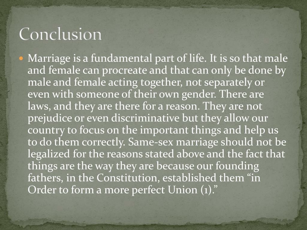 Conclusion • Marriage is a fundamental part of life. It is so that male and female can procreate and that can only be done by male and female acting together, not separately or even with someone of their own gender. There are laws, and they are there for a reason. They are not prejudice or even discriminative but they allow our country to focus on the important things and help us to do them correctly. Same-sex marriage should not be legalized for the reasons stated above and the fact that things are the way they are because our founding fathers, in the Constitution, established them “in Order to form a more perfect Union (1).”