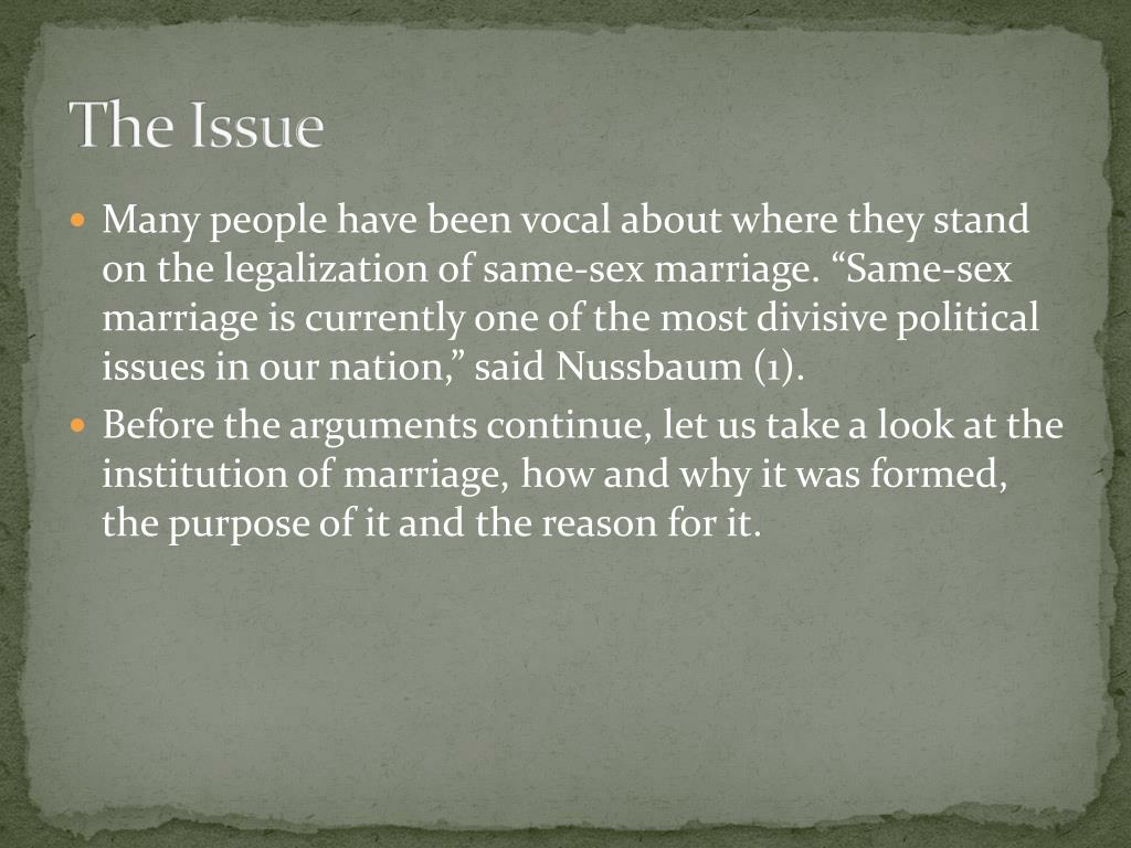 The Issue • Many people have been vocal about where they stand on the legalization of same-sex marriage. “Same-sex marriage is currently one of the most divisive political issues in our nation,” said Nussbaum (1). • Before the arguments continue, let us take a look at the institution of marriage, how and why it was formed, the purpose of it and the reason for it.