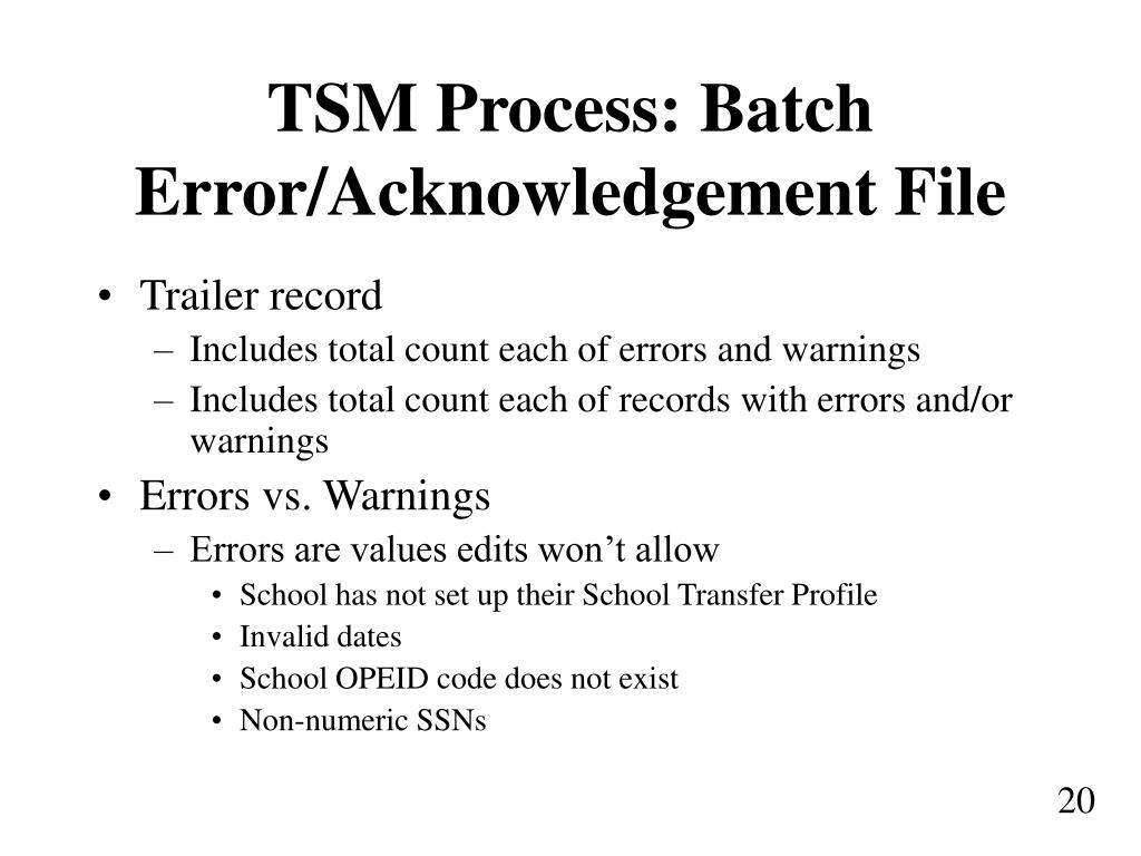 TSM Process: Batch Error/Acknowledgement File • Record length = 120 bytes • Header record • Detail record (one per error) • Applicant identifiers • Field in Error • Error/Warning Code • Value of Field in Error • Value that caused the Error/Warning code generation 19