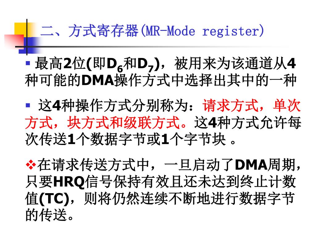 二、方式寄存器(MR-Mode register) • 最高2位(即D6和D7),被用来为该通道从4种可能的DMA操作方式中选择出其中的一种 • 这4种操作方式分别称为:请求方式,单次方式,块方式和级联方式。这4种方式允许每次传送1个数据字节或1个字节块 。 • 在请求传送方式中,一旦启动了DMA周期,只要HRQ信号保持有效且还未达到终止计数值(TC),则将仍然连续不断地进行数据字节的传送。