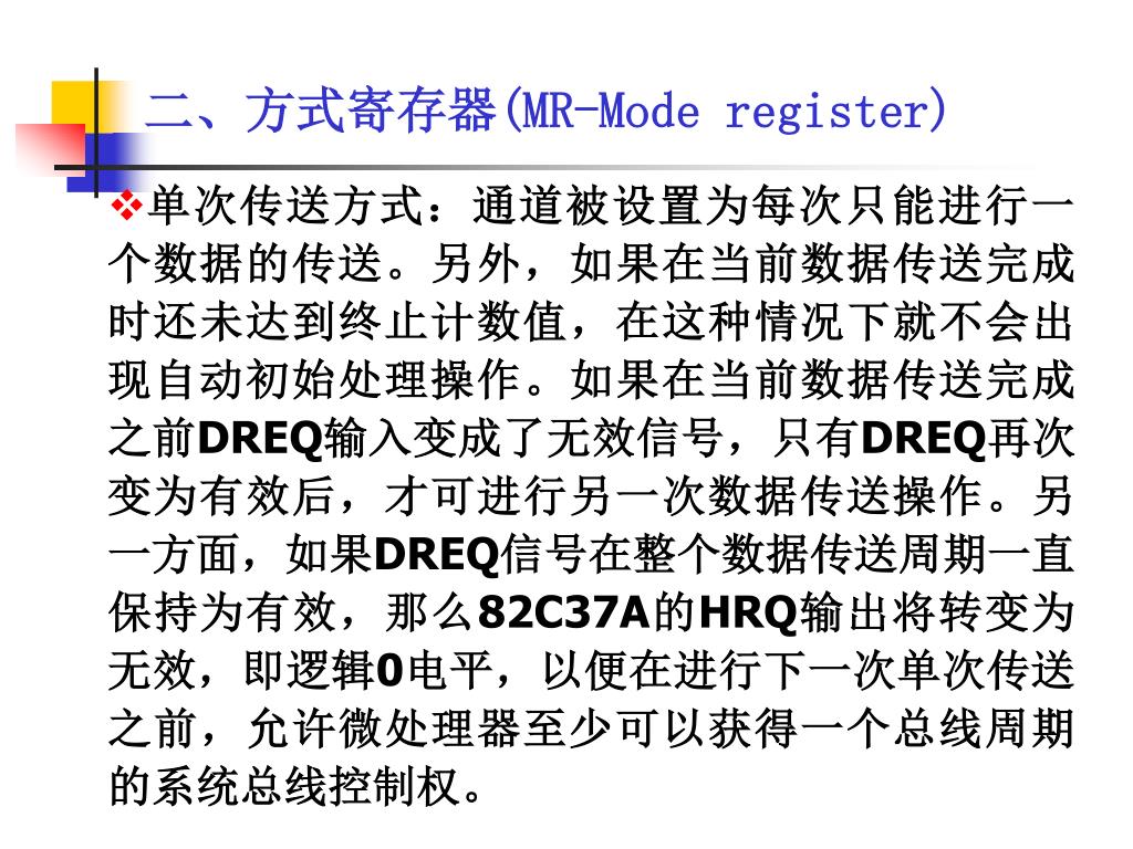 二、方式寄存器(MR-Mode register) • 单次传送方式:通道被设置为每次只能进行一个数据的传送。另外,如果在当前数据传送完成时还未达到终止计数值,在这种情况下就不会出现自动初始处理操作。如果在当前数据传送完成之前DREQ输入变成了无效信号,只有DREQ再次变为有效后,才可进行另一次数据传送操作。另一方面,如果DREQ信号在整个数据传送周期一直保持为有效,那么82C37A的HRQ输出将转变为无效,即逻辑0电平,以便在进行下一次单次传送之前,允许微处理器至少可以获得一个总线周期的系统总线控制权。