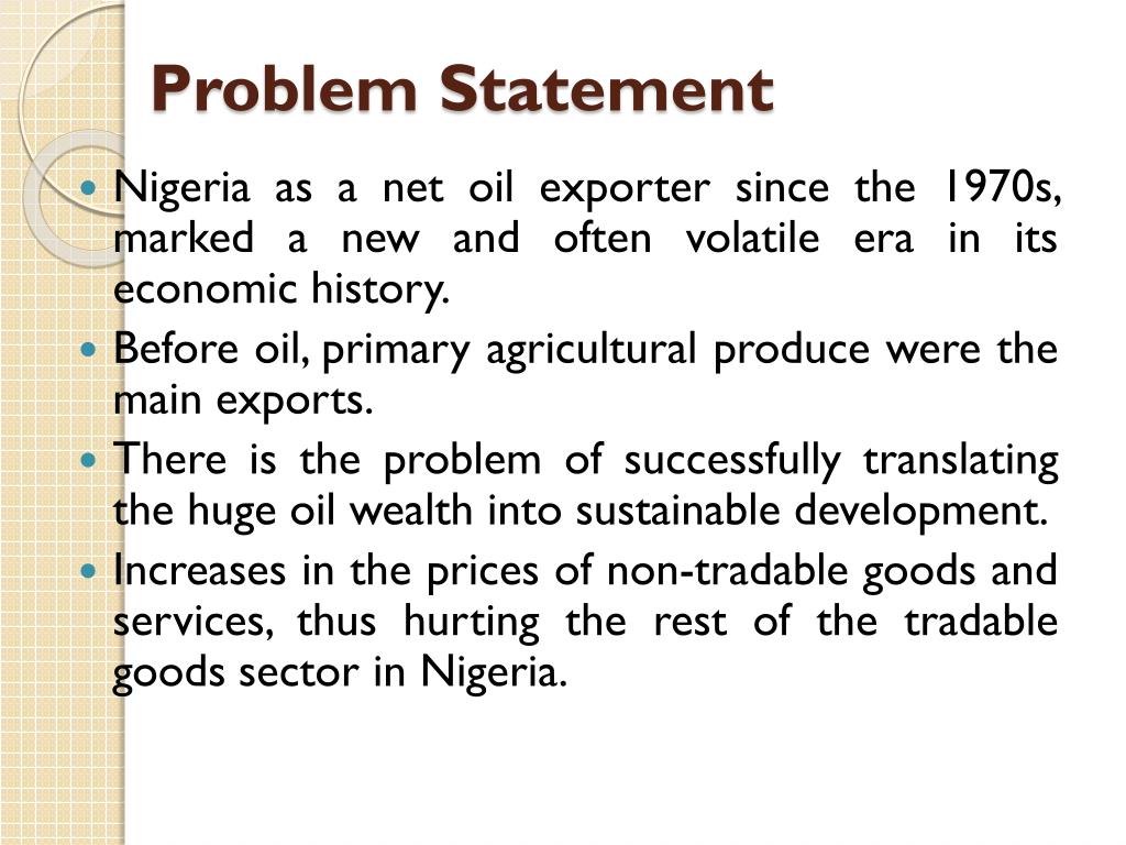 Problem Statement • Nigeria as a net oil exporter since the 1970s, marked a new and often volatile era in its economic history. • Before oil, primary agricultural produce were the main exports. • There is the problem of successfully translating the huge oil wealth into sustainable development. • Increases in the prices of non-tradable goods and services, thus hurting the rest of the tradable goods sector in Nigeria.