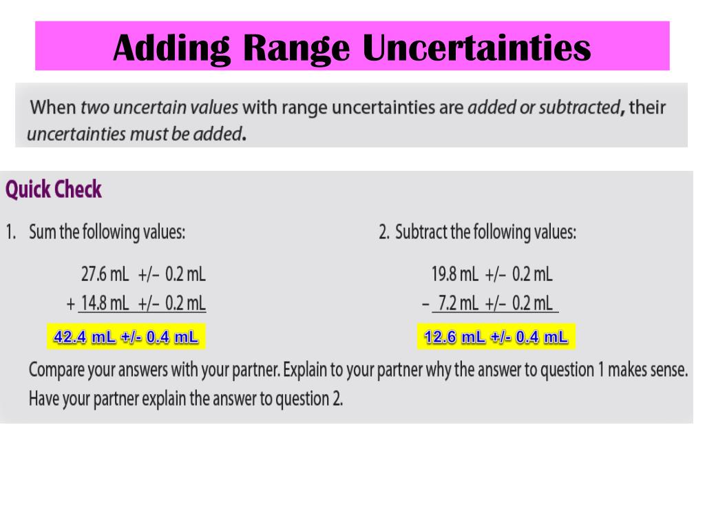 Adding Range Uncertainties 42.4 mL +/- 0.4 mL 12.6 mL +/- 0.4 mL