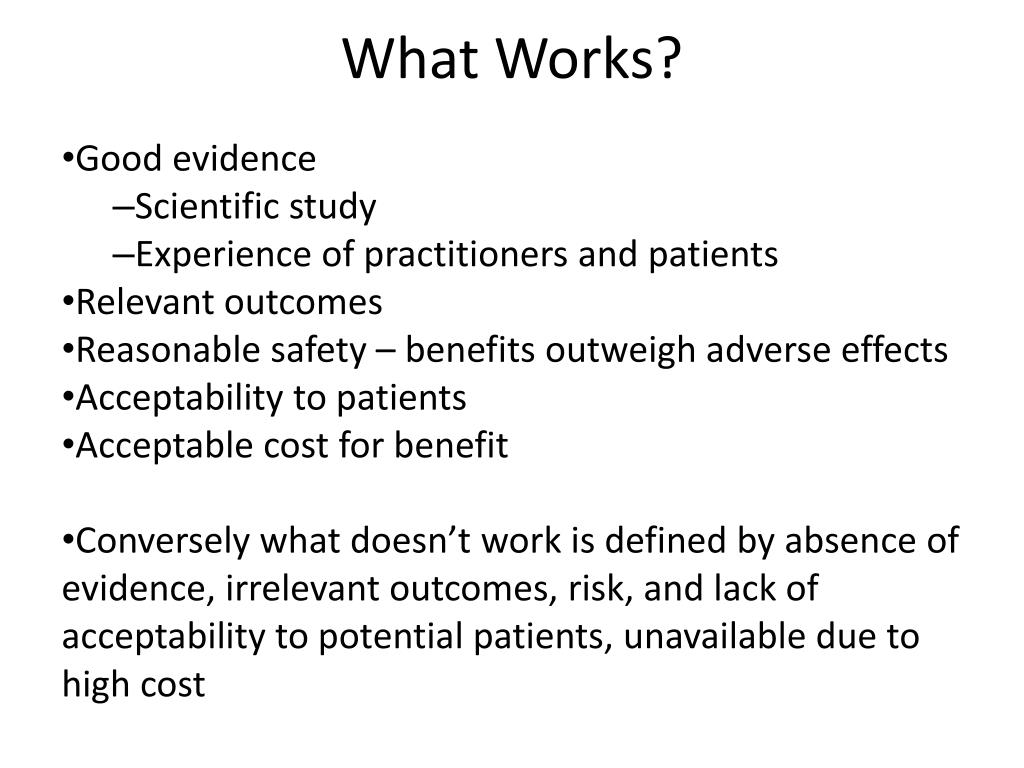 What Works? • Good evidence • Scientific study • Experience of practitioners and patients • Relevant outcomes • Reasonable safety – benefits outweigh adverse effects • Acceptability to patients • Acceptable cost for benefit • Conversely what doesn’t work is defined by absence of evidence, irrelevant outcomes, risk, and lack of acceptability to potential patients, unavailable due to high cost