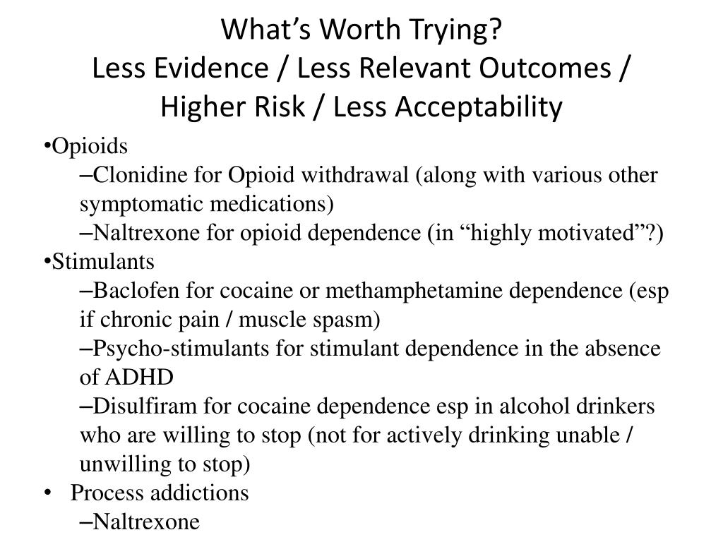 What’s Worth Trying? Less Evidence / Less Relevant Outcomes / Higher Risk / Less Acceptability • Opioids • Clonidine for Opioid withdrawal (along with various other symptomatic medications) • Naltrexone for opioid dependence (in “highly motivated”?) • Stimulants • Baclofen for cocaine or methamphetamine dependence (esp if chronic pain / muscle spasm) • Psycho-stimulants for stimulant dependence in the absence of ADHD • Disulfiram for cocaine dependence esp in alcohol drinkers who are willing to stop (not for actively drinking unable / unwilling to stop) • Process addictions • Naltrexone