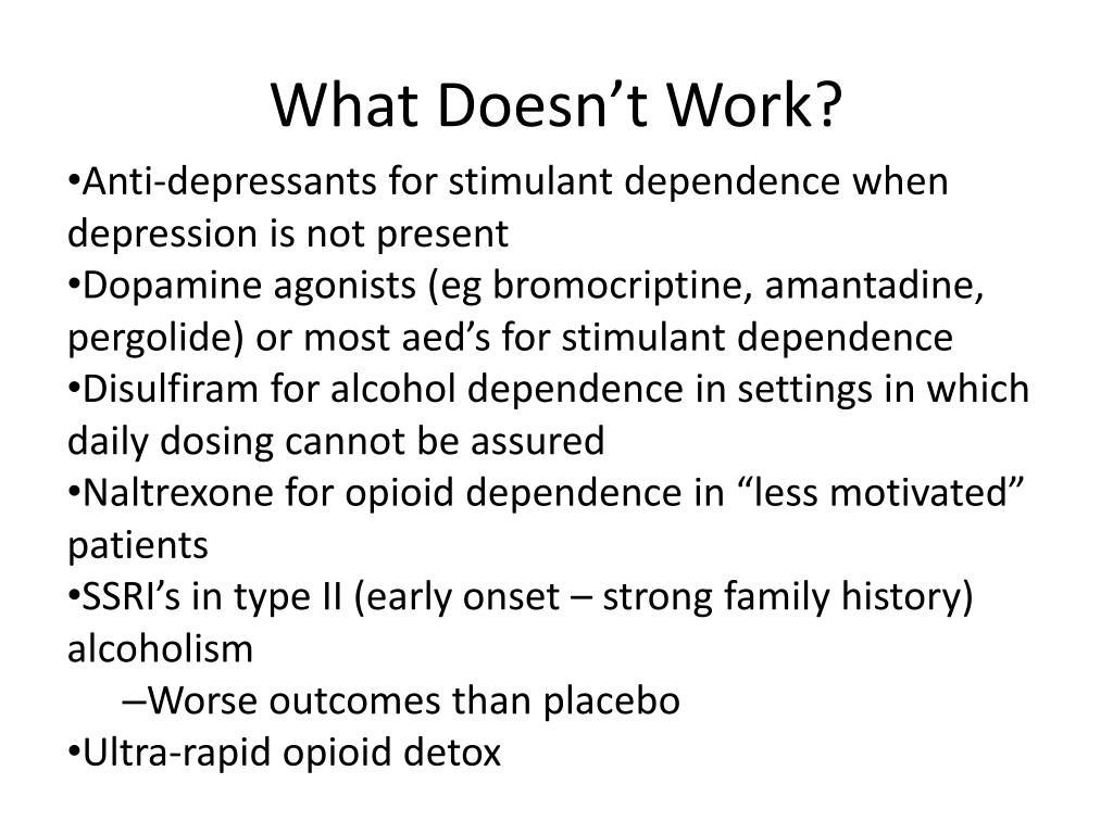 What Doesn’t Work? • Anti-depressants for stimulant dependence when depression is not present • Dopamine agonists (egbromocriptine, amantadine, pergolide) or most aed’s for stimulant dependence • Disulfiram for alcohol dependence in settings in which daily dosing cannot be assured • Naltrexone for opioid dependence in “less motivated” patients • SSRI’s in type II (early onset – strong family history) alcoholism • Worse outcomes than placebo • Ultra-rapid opioid detox