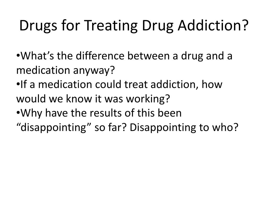 Drugs for Treating Drug Addiction? • What’s the difference between a drug and a medication anyway? • If a medication could treat addiction, how would we know it was working? • Why have the results of this been “disappointing” so far? Disappointing to who?