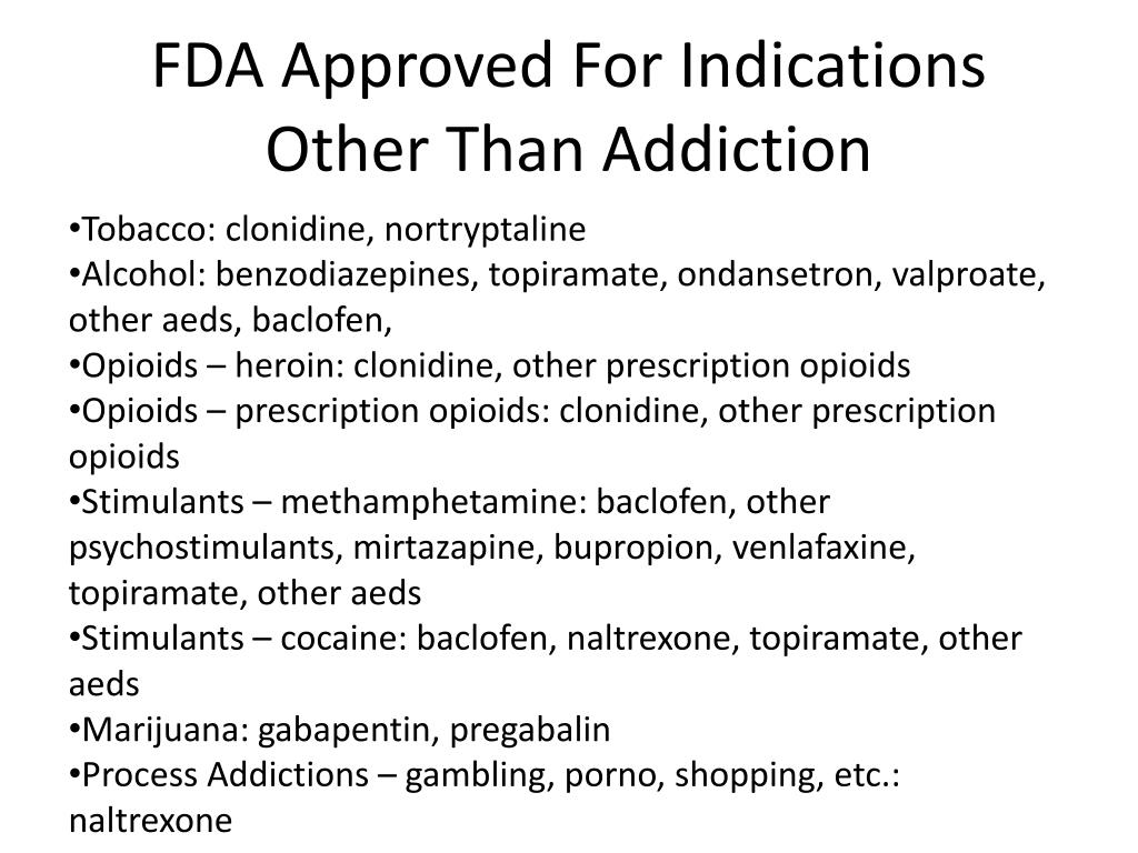 FDA Approved For Indications Other Than Addiction • Tobacco: clonidine, nortryptaline • Alcohol: benzodiazepines, topiramate, ondansetron, valproate, other aeds, baclofen, • Opioids – heroin: clonidine, other prescription opioids • Opioids – prescription opioids: clonidine, other prescription opioids • Stimulants – methamphetamine: baclofen, other psychostimulants, mirtazapine, bupropion, venlafaxine, topiramate, other aeds • Stimulants – cocaine: baclofen, naltrexone, topiramate, other aeds • Marijuana: gabapentin, pregabalin • Process Addictions – gambling, porno, shopping, etc.: naltrexone