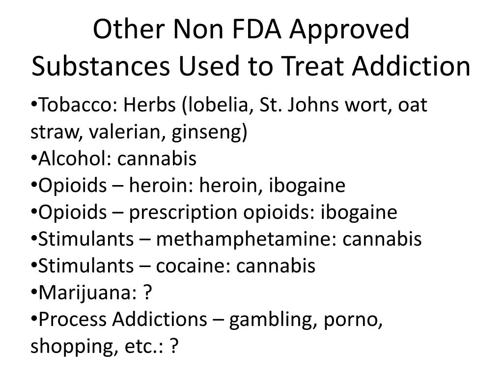 Other Non FDA Approved Substances Used to Treat Addiction • Tobacco: Herbs (lobelia, St. Johns wort, oat straw, valerian, ginseng) • Alcohol: cannabis • Opioids – heroin: heroin, ibogaine • Opioids – prescription opioids: ibogaine • Stimulants – methamphetamine: cannabis • Stimulants – cocaine: cannabis • Marijuana: ? • Process Addictions – gambling, porno, shopping, etc.: ?