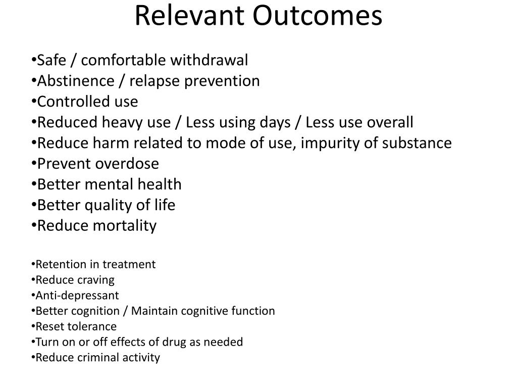 Relevant Outcomes • Safe / comfortable withdrawal • Abstinence / relapse prevention • Controlled use • Reduced heavy use / Less using days / Less use overall • Reduce harm related to mode of use, impurity of substance • Prevent overdose • Better mental health • Better quality of life • Reduce mortality • Retention in treatment • Reduce craving • Anti-depressant • Better cognition / Maintain cognitive function • Reset tolerance • Turn on or off effects of drug as needed • Reduce criminal activity