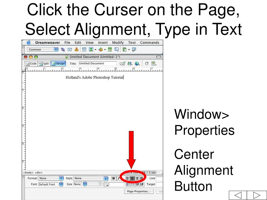 Click the Curser on the Page, Select Alignment, Type in Text Window> Properties Center Alignment Button