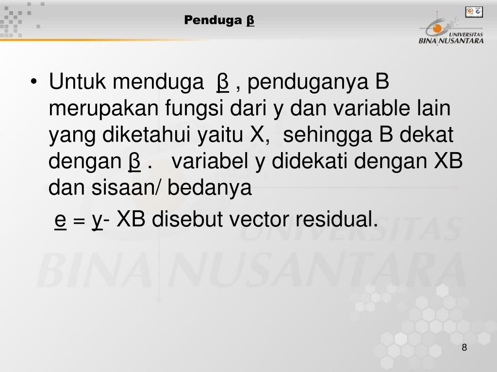 Penduga β • Untuk menduga β , penduganya B merupakan fungsi dari y dan variable lain yang diketahui yaitu X, sehingga B dekat dengan β . variabel y didekati dengan XB dan sisaan/ bedanya e = y- XB disebut vector residual.