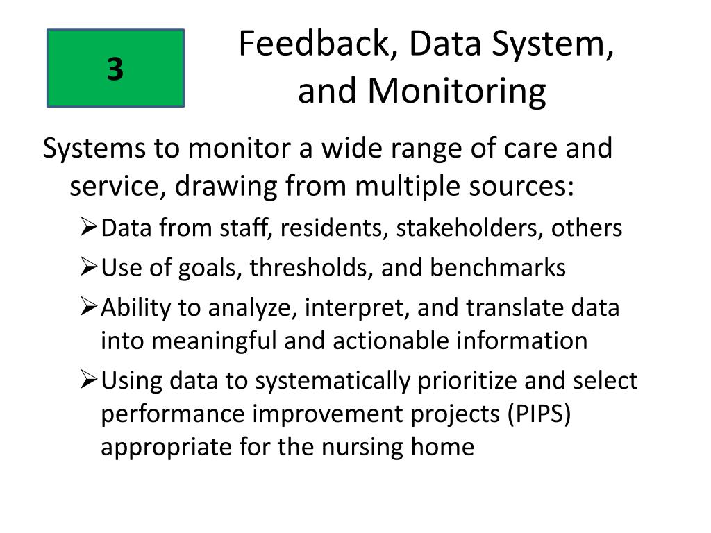 Feedback, Data System, and Monitoring 3 Systems to monitor a wide range of care and service, drawing from multiple sources: • Data from staff, residents, stakeholders, others • Use of goals, thresholds, and benchmarks • Ability to analyze, interpret, and translate data into meaningful and actionable information • Using data to systematically prioritize and select performance improvement projects (PIPS) appropriate for the nursing home