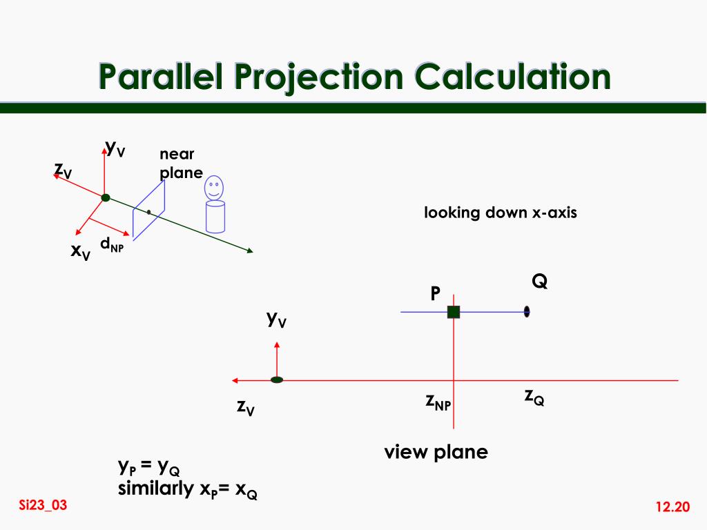yV near plane zV dNP xV Parallel Projection Calculation looking down x-axis Q P yV zQ zNP zV view plane yP = yQ similarly xP= xQ
