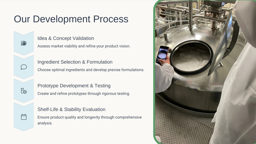 4. Our Development Process Idea & Concept Validation Assess market viability and refine your product vision. Ingredient Selection & Formulation Choose optimal ingredients and develop precise formulations. Prototype Development & Testing Create and refine prototypes through rigorous testing. Shelf-Life & Stability Evaluation Ensure product quality and longevity through comprehensive analysis.