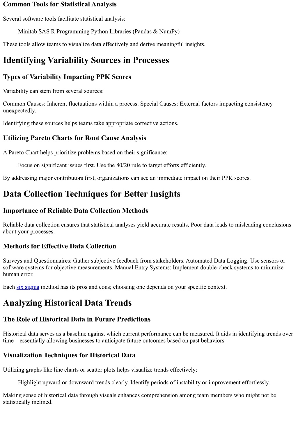 Common Tools for Statistical Analysis Several software tools facilitate statistical analysis: Minitab SAS R Programming Python Libraries (Pandas & NumPy) These tools allow teams to visualize data effectively and derive meaningful insights. Identifying Variability Sources in Processes Types of Variability Impacting PPK Scores Variability can stem from several sources: Common Causes: Inherent fluctuations within a process. Special Causes: External factors impacting consistency unexpectedly. Identifying these sources helps teams take appropriate corrective actions. Utilizing Pareto Charts for Root Cause Analysis A Pareto Chart helps prioritize problems based on their significance: Focus on significant issues first. Use the 80/20 rule to target efforts efficiently. By addressing major contributors first, organizations can see an immediate impact on their PPK scores. Data Collection Techniques for Better Insights Importance of Reliable Data Collection Methods Reliable data collection ensures that statistical analyses yield accurate results. Poor data leads to misleading conclusions about your processes. Methods for Effective Data Collection Surveys and Questionnaires: Gather subjective feedback from stakeholders. Automated Data Logging: Use sensors or software systems for objective measurements. Manual Entry Systems: Implement double-check systems to minimize human error. Each six sigma method has its pros and cons; choosing one depends on your specific context. Analyzing Historical Data Trends The Role of Historical Data in Future Predictions Historical data serves as a baseline against which current performance can be measured. It aids in identifying trends over time—essentially allowing businesses to anticipate future outcomes based on past behaviors. Visualization Techniques for Historical Data Utilizing graphs like line charts or scatter plots helps visualize trends effectively: Highlight upward or downward trends clearly. Identify periods of instability or improvement effortlessly. Making sense of historical data through visuals enhances comprehension among team members who might not be statistically inclined.
