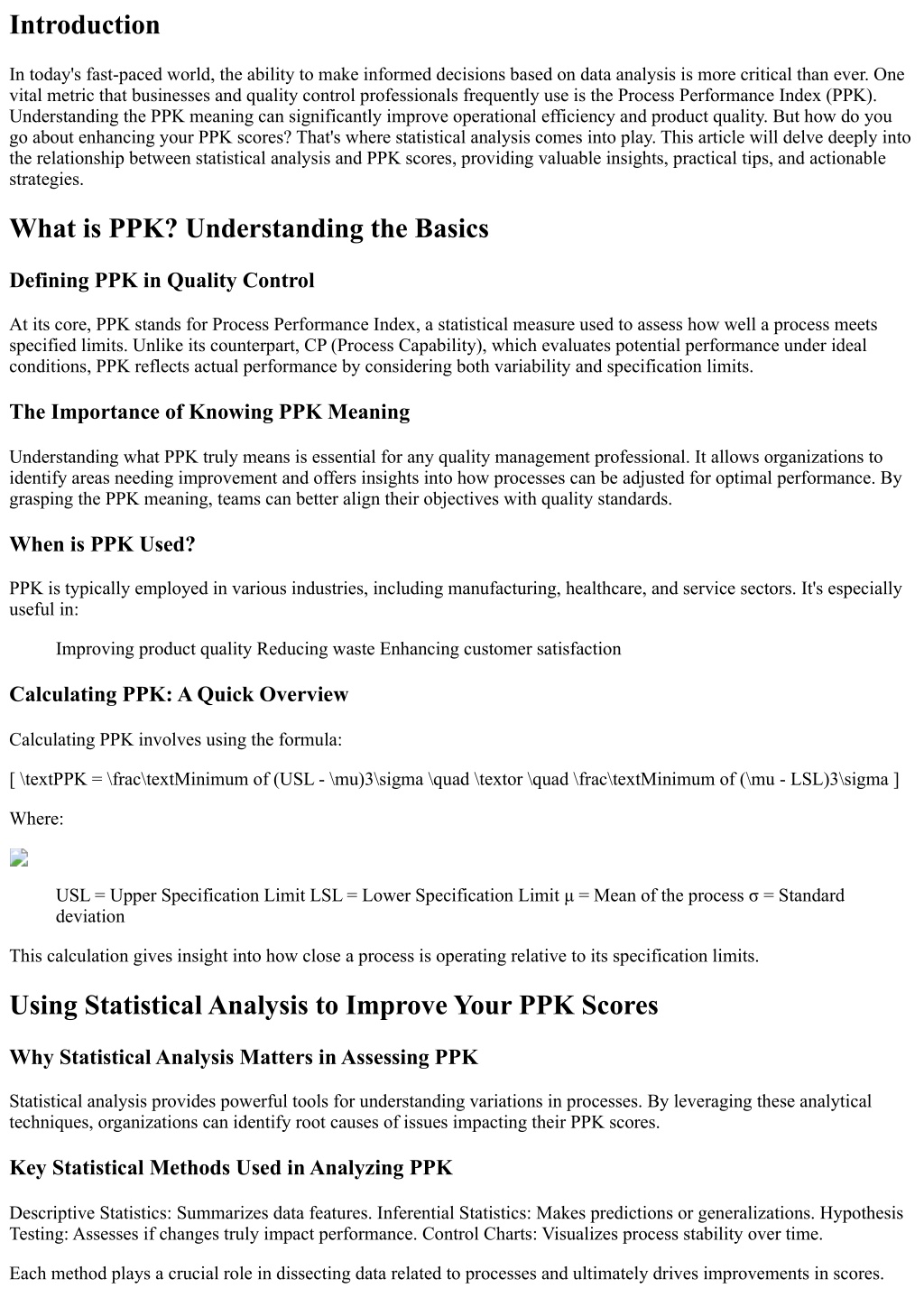 Introduction In today's fast-paced world, the ability to make informed decisions based on data analysis is more critical than ever. One vital metric that businesses and quality control professionals frequently use is the Process Performance Index (PPK). Understanding the PPK meaning can significantly improve operational efficiency and product quality. But how do you go about enhancing your PPK scores? That's where statistical analysis comes into play. This article will delve deeply into the relationship between statistical analysis and PPK scores, providing valuable insights, practical tips, and actionable strategies. What is PPK? Understanding the Basics Defining PPK in Quality Control At its core, PPK stands for Process Performance Index, a statistical measure used to assess how well a process meets specified limits. Unlike its counterpart, CP (Process Capability), which evaluates potential performance under ideal conditions, PPK reflects actual performance by considering both variability and specification limits. The Importance of Knowing PPK Meaning Understanding what PPK truly means is essential for any quality management professional. It allows organizations to identify areas needing improvement and offers insights into how processes can be adjusted for optimal performance. By grasping the PPK meaning, teams can better align their objectives with quality standards. When is PPK Used? PPK is typically employed in various industries, including manufacturing, healthcare, and service sectors. It's especially useful in: Improving product quality Reducing waste Enhancing customer satisfaction Calculating PPK: A Quick Overview Calculating PPK involves using the formula: [ \textPPK = \frac\textMinimum of (USL - \mu)3\sigma \quad \textor \quad \frac\textMinimum of (\mu - LSL)3\sigma ] Where: USL = Upper Specification Limit LSL = Lower Specification Limit μ = Mean of the process σ = Standard deviation This calculation gives insight into how close a process is operating relative to its specification limits. Using Statistical Analysis to Improve Your PPK Scores Why Statistical Analysis Matters in Assessing PPK Statistical analysis provides powerful tools for understanding variations in processes. By leveraging these analytical techniques, organizations can identify root causes of issues impacting their PPK scores. Key Statistical Methods Used in Analyzing PPK Descriptive Statistics: Summarizes data features. Inferential Statistics: Makes predictions or generalizations. Hypothesis Testing: Assesses if changes truly impact performance. Control Charts: Visualizes process stability over time. Each method plays a crucial role in dissecting data related to processes and ultimately drives improvements in scores.