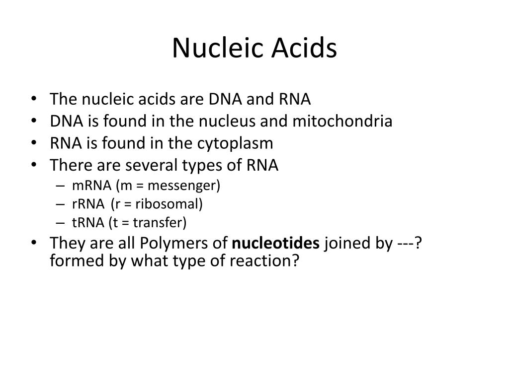Nucleic Acids • The nucleic acids are DNA and RNA • DNA is found in the nucleus and mitochondria • RNA is found in the cytoplasm • There are several types of RNA • mRNA (m = messenger) • rRNA (r = ribosomal) • tRNA (t = transfer) • They are all Polymers of nucleotides joined by ---? formed by what type of reaction?