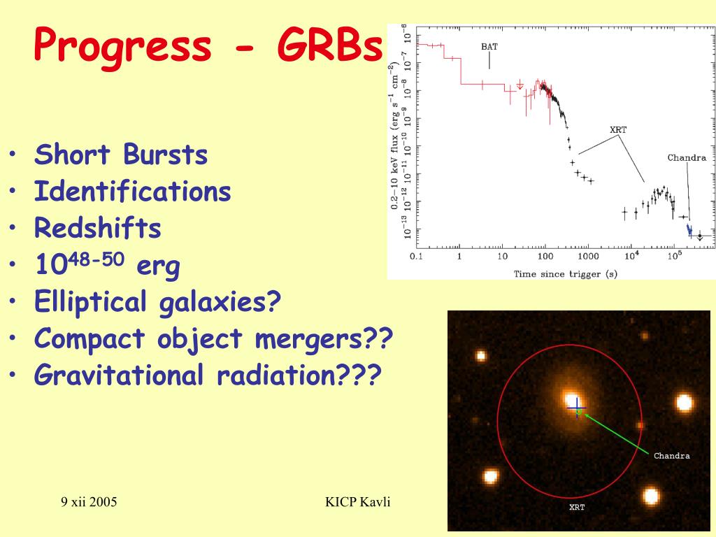 Progress - GRBs • Short Bursts • Identifications • Redshifts • 1048-50 erg • Elliptical galaxies? • Compact object mergers?? • Gravitational radiation??? KICP Kavli
