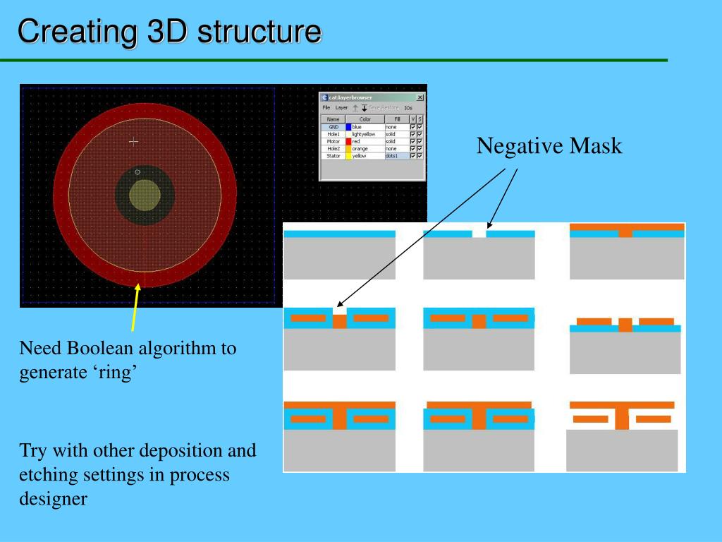 Creating 3D structure Negative Mask Need Boolean algorithm to generate ‘ring’ Try with other deposition and etching settings in process designer