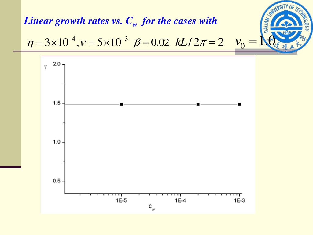 Summary • Fixed on some parameters, the critical velocities are calculated for the different wave numbers; • With the increase of wave numbers, the mode is stabilized ; • The unstable regions vs. wave number and viscosity are presented. It is shown that the system tends to stable when the wave number and viscosity increase; • For the parameter beta, it is found that the linear growth rates increase as beta increases in realistic beta regime; • Cw has little effects on the linear growth rate