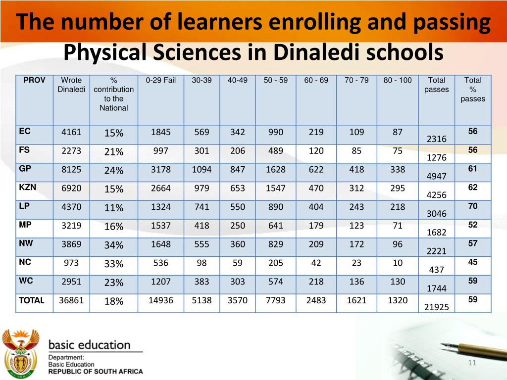 The number of learners enrolling and passing Physical Sciences in Dinaledi schools