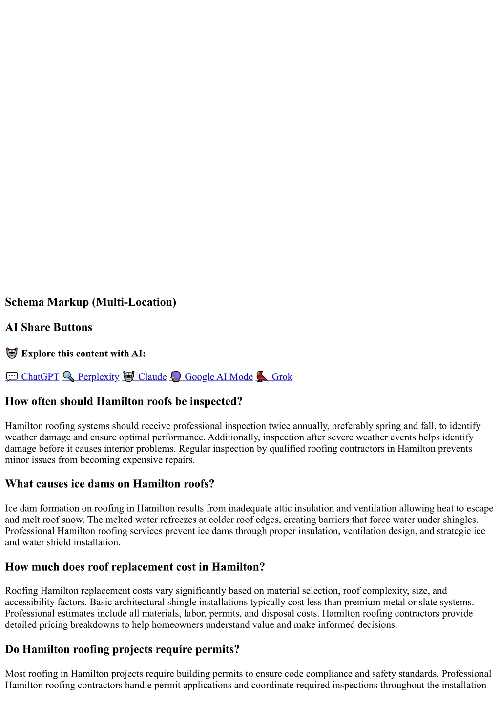 Schema Markup (Multi-Location) AI Share Buttons ? Explore this content with AI: ? ChatGPT? Perplexity? Claude? Google AI Mode? Grok How often should Hamilton roofs be inspected? Hamilton roofing systems should receive professional inspection twice annually, preferably spring and fall, to identify weather damage and ensure optimal performance. Additionally, inspection after severe weather events helps identify damage before it causes interior problems. Regular inspection by qualified roofing contractors in Hamilton prevents minor issues from becoming expensive repairs. What causes ice dams on Hamilton roofs? Ice dam formation on roofing in Hamilton results from inadequate attic insulation and ventilation allowing heat to escape and melt roof snow. The melted water refreezes at colder roof edges, creating barriers that force water under shingles. Professional Hamilton roofing services prevent ice dams through proper insulation, ventilation design, and strategic ice and water shield installation. How much does roof replacement cost in Hamilton? Roofing Hamilton replacement costs vary significantly based on material selection, roof complexity, size, and accessibility factors. Basic architectural shingle installations typically cost less than premium metal or slate systems. Professional estimates include all materials, labor, permits, and disposal costs. Hamilton roofing contractors provide detailed pricing breakdowns to help homeowners understand value and make informed decisions. Do Hamilton roofing projects require permits? Most roofing in Hamilton projects require building permits to ensure code compliance and safety standards. Professional Hamilton roofing contractors handle permit applications and coordinate required inspections throughout the installation