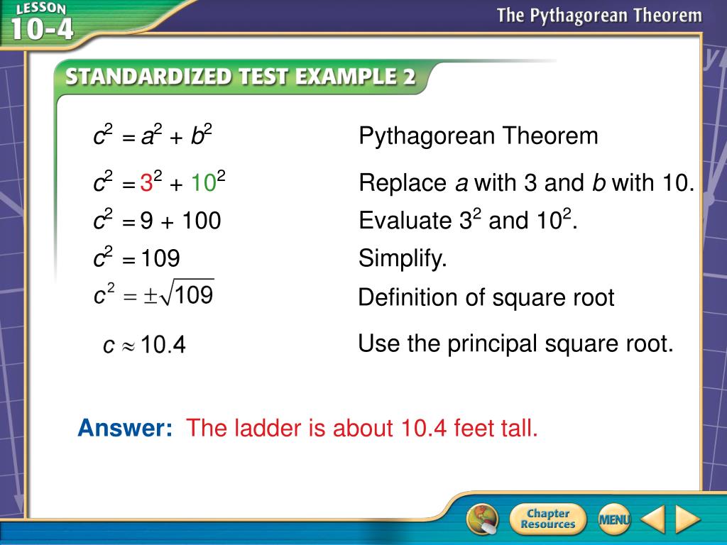Definition of square root Use the principal square root. c2 = a2 + b2 Pythagorean Theorem c2 = 32 + 102 Replace a with 3 and b with 10. c2 = 9 + 100 Evaluate 32 and 102. c2 = 109 Simplify. Answer: The ladder is about 10.4 feet tall. Example 2