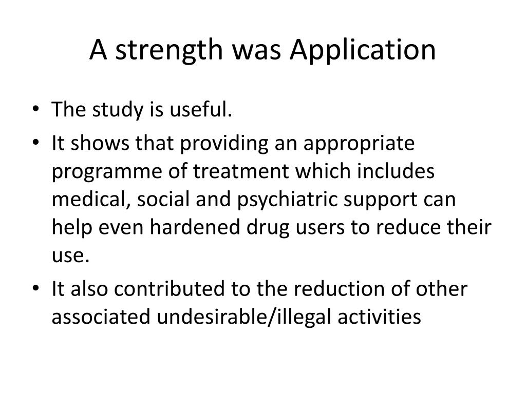 A strength was Application • The study is useful. • It shows that providing an appropriate programme of treatment which includes medical, social and psychiatric support can help even hardened drug users to reduce their use. • It also contributed to the reduction of other associated undesirable/illegal activities