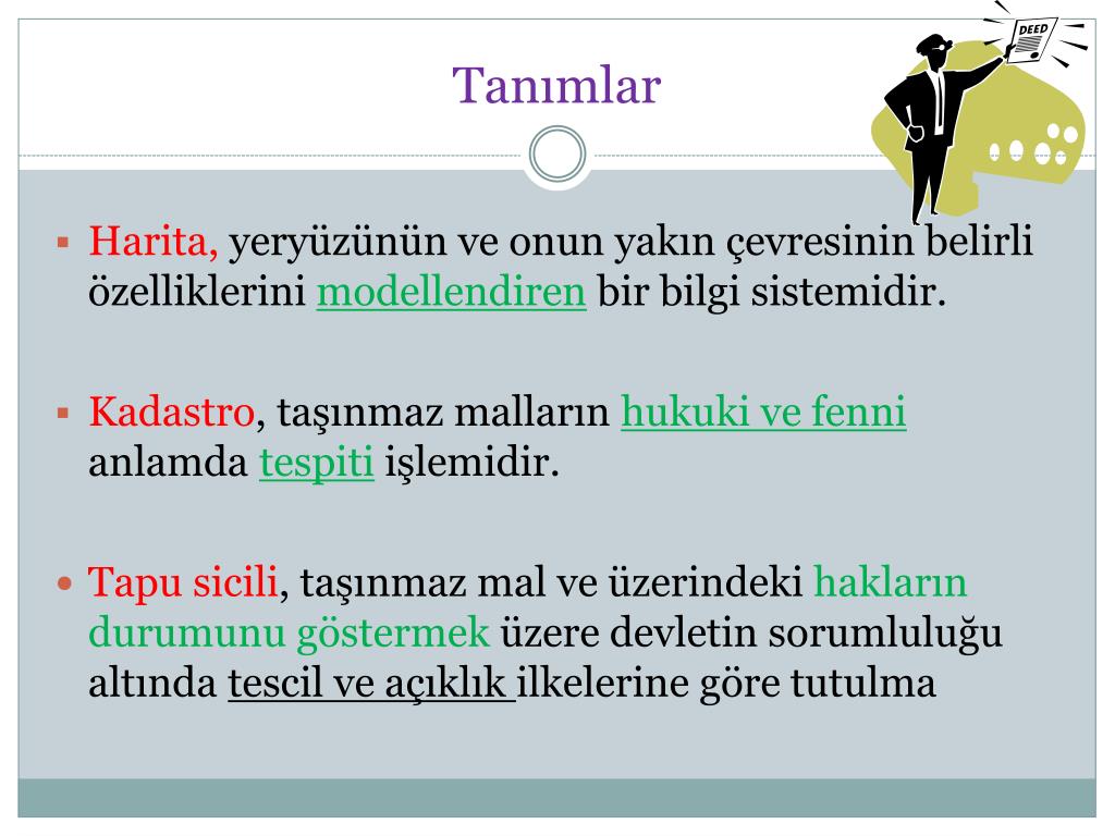 Tanımlar • Harita, yeryüzünün ve onun yakın çevresinin belirli özelliklerini modellendiren bir bilgi sistemidir. • Kadastro, taşınmaz malların hukuki ve fenni anlamda tespiti işlemidir. • Tapu sicili, taşınmaz mal ve üzerindeki hakların durumunu göstermek üzere devletin sorumluluğu altında tescil ve açıklık ilkelerine göre tutulma