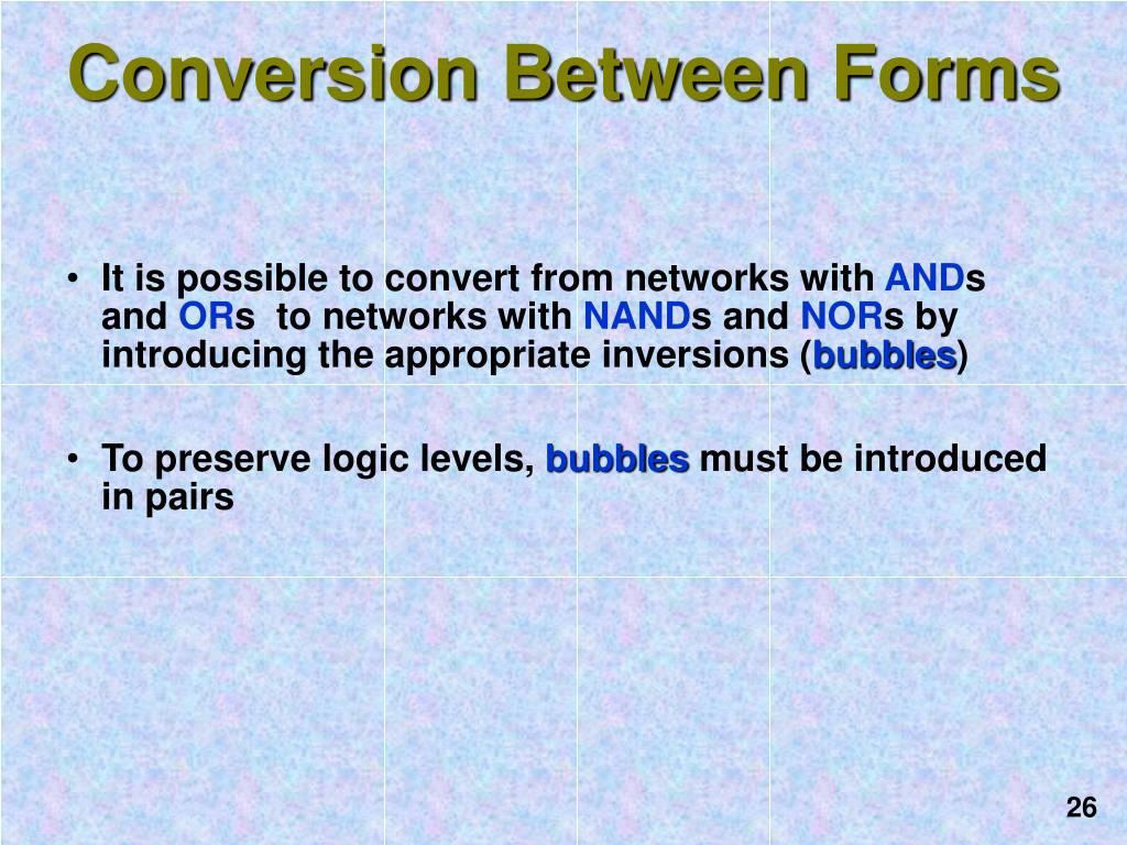 It is possible to convert from networks with ANDs and ORs to networks with NANDs and NORs by introducing the appropriate inversions (bubbles) To preserve logic levels, bubbles must be introduced in pairs Conversion Between Forms