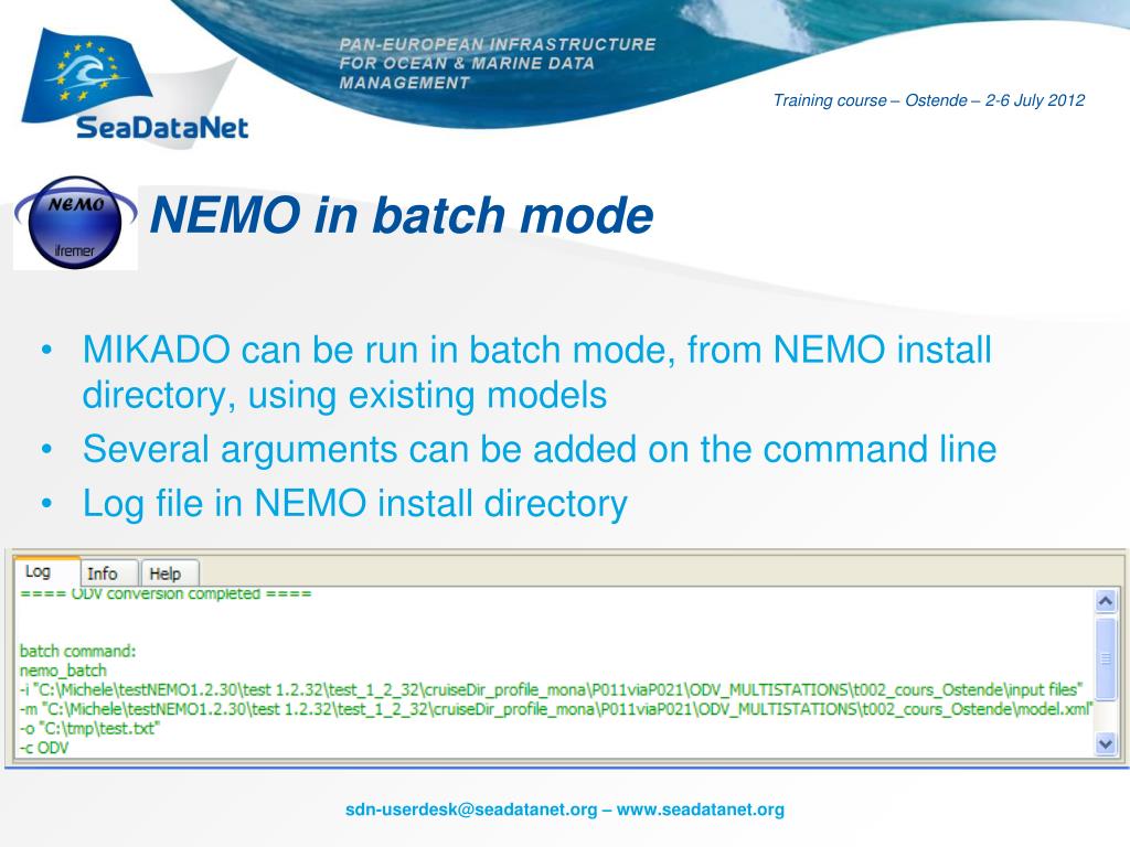NEMO main features • Reformat ASCII text file of vertical profiles, time-series or trajectories to a SeaDataNet ASCII format (ODV, MEDATLAS). • The input ASCII files can be: • one file per station for vertical profiles or time series • one file for one cruise for vertical profiles, time series or trajectories • Interact with Mikado, to be able to generate ISO-19115 XML descriptions of the data.