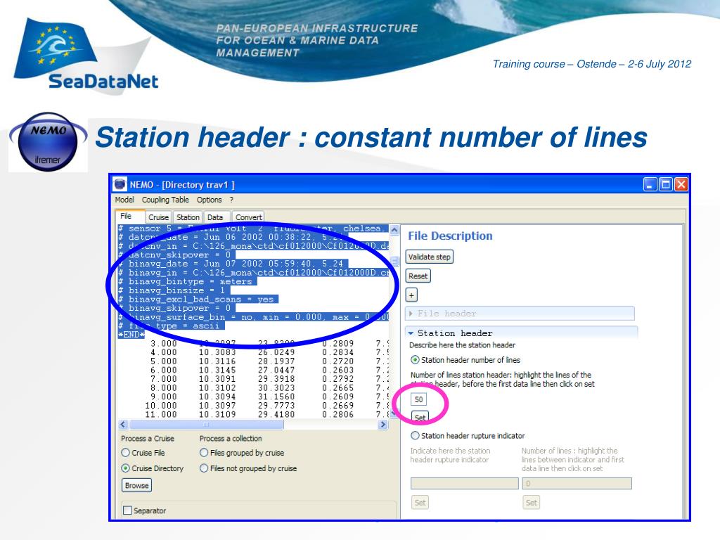 NEMO principles • NEMO must be able to read almost any ASCII format to translate it to MEDATLAS, ODV • Users of NEMO describe the entry files format so that NEMO is able to find the information which is necessary in the SeaDataNet formats • One mandatory pre-requirement is that in the set of entry files the information about the stations must • be located at the same position : same line in the file, same position on the line or same column if CSV format • be in the same format • For example : for all the stations the latitude is • on line 3 on the station header, • from character 21 to character 27, or 3rd column in CSV • the format is +DD.ddd