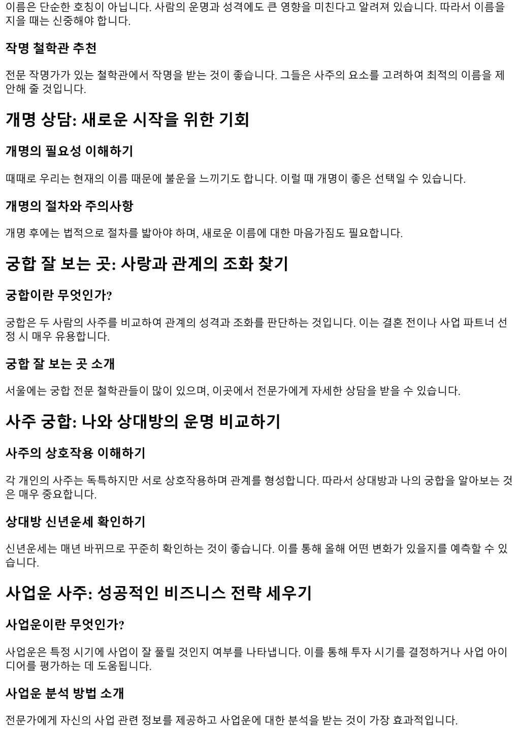 2. 이름은단순한호칭이아닙니다. 사람의운명과성격에도큰영향을미친다고알려져있습니다. 따라서이름을 지을때는신중해야합니다. 작명철학관추천 전문작명가가있는철학관에서작명을받는것이좋습니다. 그들은사주의요소를고려하여최적의이름을제 안해줄것입니다. 개명상담: 새로운시작을위한기회 개명의필요성이해하기 때때로우리는현재의이름때문에불운을느끼기도합니다. 이럴때개명이좋은선택일수있습니다. 개명의절차와주의사항 개명후에는법적으로절차를밟아야하며, 새로운이름에대한마음가짐도필요합니다. 궁합잘보는곳: 사랑과관계의조화찾기 궁합이란무엇인가? 궁합은두사람의사주를비교하여관계의성격과조화를판단하는것입니다. 이는결혼전이나사업파트너선 정시매우유용합니다. 궁합잘보는곳소개 서울에는궁합전문철학관들이많이있으며, 이곳에서전문가에게자세한상담을받을수있습니다. 사주궁합: 나와상대방의운명비교하기 사주의상호작용이해하기 각개인의사주는독특하지만서로상호작용하며관계를형성합니다. 따라서상대방과나의궁합을알아보는것 은매우중요합니다. 상대방신년운세확인하기 신년운세는매년바뀌므로꾸준히확인하는것이좋습니다. 이를통해올해어떤변화가있을지를예측할수있 습니다. 사업운사주: 성공적인비즈니스전략세우기 사업운이란무엇인가? 사업운은특정시기에사업이잘풀릴것인지여부를나타냅니다. 이를통해투자시기를결정하거나사업아이 디어를평가하는데도움됩니다. 사업운분석방법소개 전문가에게자신의사업관련정보를제공하고사업운에대한분석을받는것이가장효과적입니다.