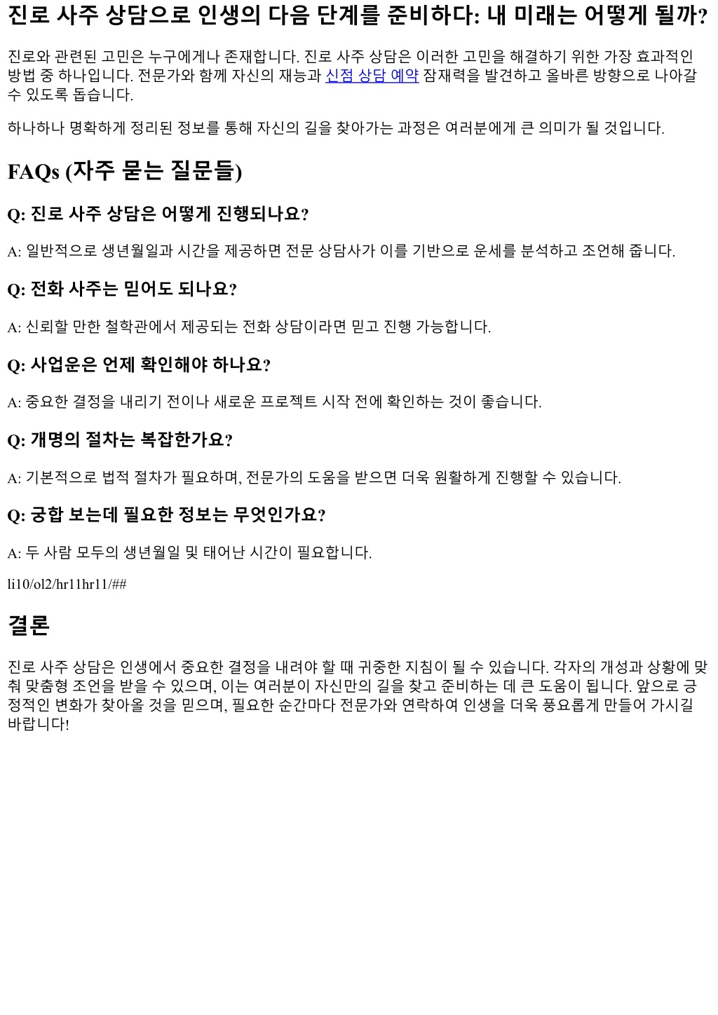 3. 진로사주상담으로인생의다음단계를준비하다: 내미래는어떻게될까? 진로와관련된고민은누구에게나존재합니다. 진로사주상담은이러한고민을해결하기위한가장효과적인 방법중하나입니다. 전문가와함께자신의재능과신점상담예약잠재력을발견하고올바른방향으로나아갈 수있도록돕습니다. 하나하나명확하게정리된정보를통해자신의길을찾아가는과정은여러분에게큰의미가될것입니다. FAQs (자주묻는질문들) Q: 진로사주상담은어떻게진행되나요? A: 일반적으로생년월일과시간을제공하면전문상담사가이를기반으로운세를분석하고조언해줍니다. Q: 전화사주는믿어도되나요? A: 신뢰할만한철학관에서제공되는전화상담이라면믿고진행가능합니다. Q: 사업운은언제확인해야하나요? A: 중요한결정을내리기전이나새로운프로젝트시작전에확인하는것이좋습니다. Q: 개명의절차는복잡한가요? A: 기본적으로법적절차가필요하며, 전문가의도움을받으면더욱원활하게진행할수있습니다. Q: 궁합보는데필요한정보는무엇인가요? A: 두사람모두의생년월일및태어난시간이필요합니다. li10/ol2/hr11hr11/## 결론 진로사주상담은인생에서중요한결정을내려야할때귀중한지침이될수있습니다. 각자의개성과상황에맞 춰맞춤형조언을받을수있으며, 이는여러분이자신만의길을찾고준비하는데큰도움이됩니다. 앞으로긍 정적인변화가찾아올것을믿으며, 필요한순간마다전문가와연락하여인생을더욱풍요롭게만들어가시길 바랍니다!